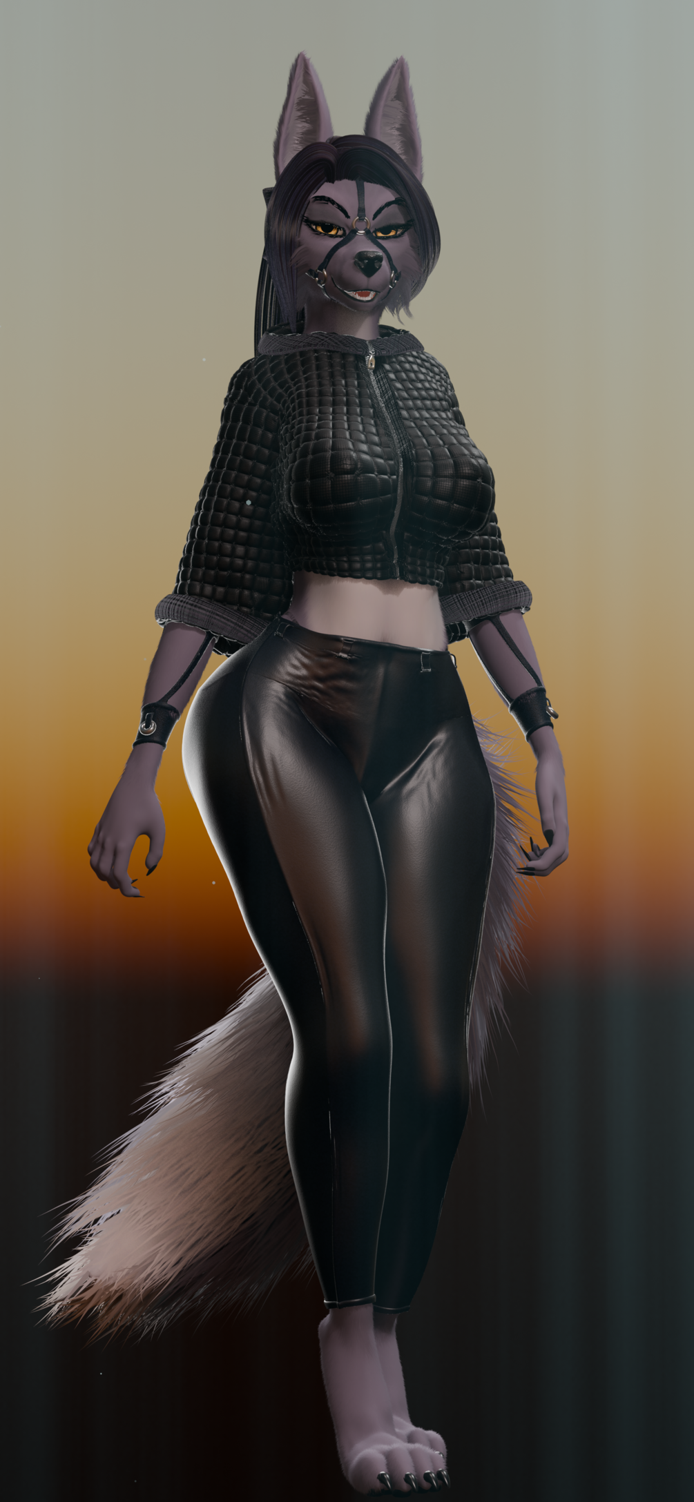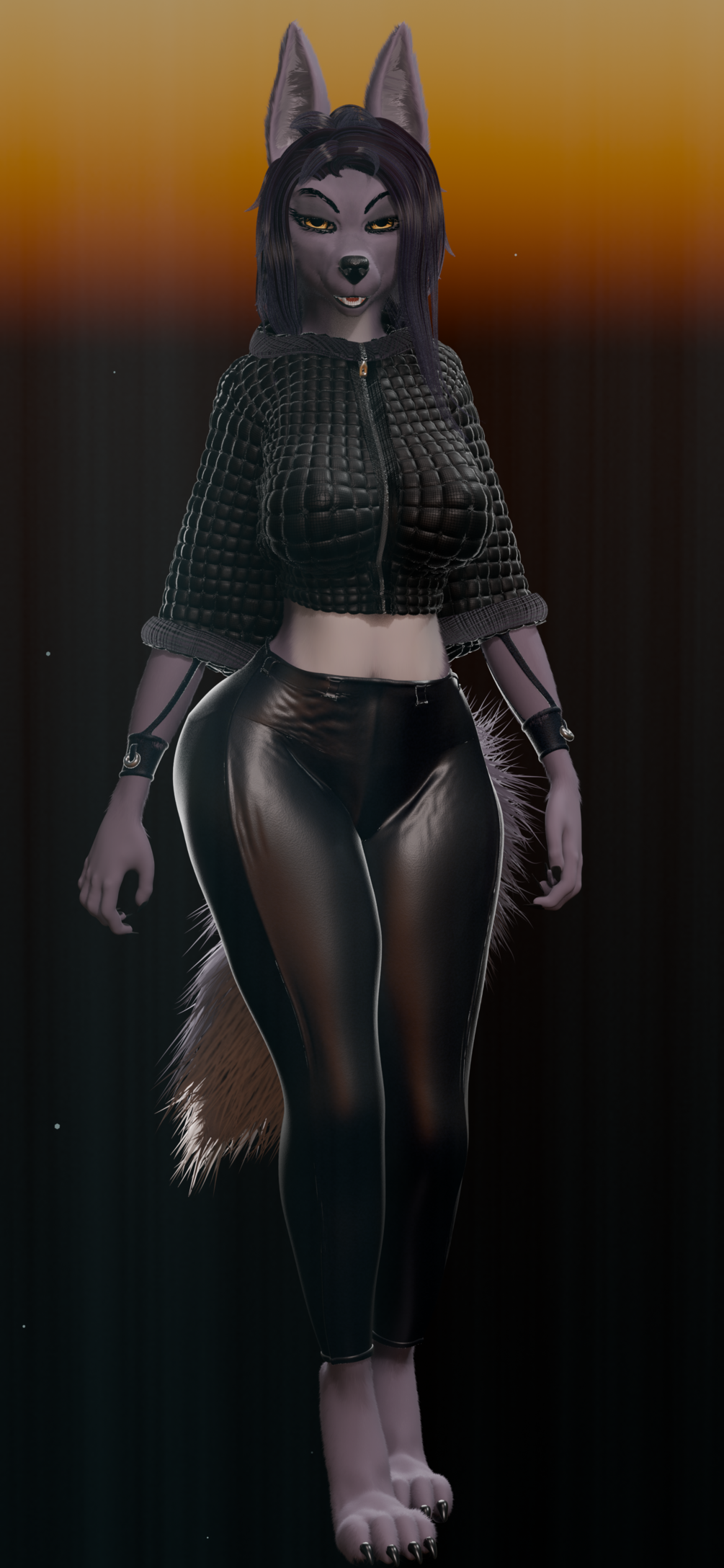 Marie has a bold and revealing style that reflects her confident personality. She wears a dark, open kemono that casually drapes over her shoulders, offering a glimpse of her risqué top—a touch of lace that reveals more than it conceals. Beneath, she is wearing a tight black tanga, paired with fishnet stockings featuring a playful pattern that adds a hint of rebellion. Her clawed feet are bare, no need for footwear after all. Around her wrists, she wears wide leather bracelets , underscoring her wild, independent side.